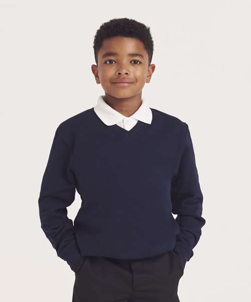 V-neckline sweatshirt. Ribbed neckline, cuffs and hemline. Soft cotton faced fabric creates ideal printing surface. Name label. Taped neck at back neck. Twin needle stitching for durability.