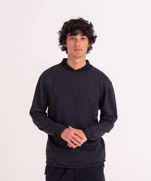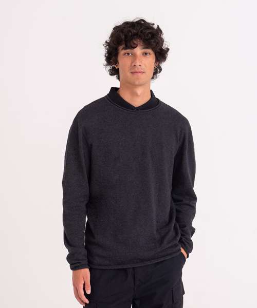 Lightweight sweater made from regenerated cotton. Set-in sleeves with rolled cuffs , hem and collar.