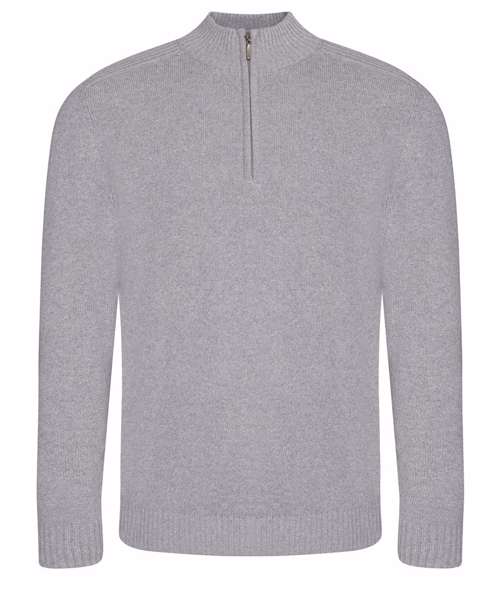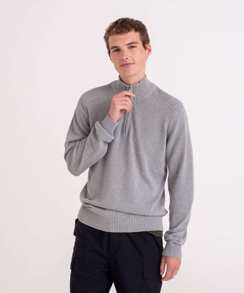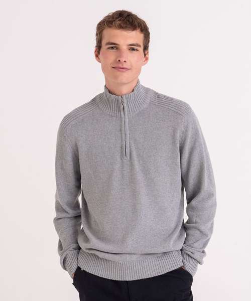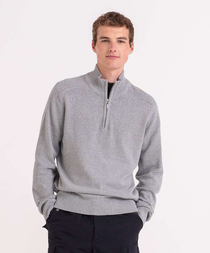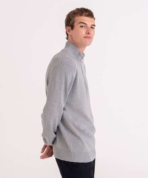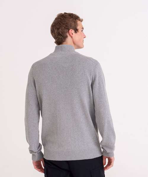 Long sleeve sweater made from regenerated cotton with tall collar and ¼ zip neck. Contrast rib stitches at shoulders cuff and hem.