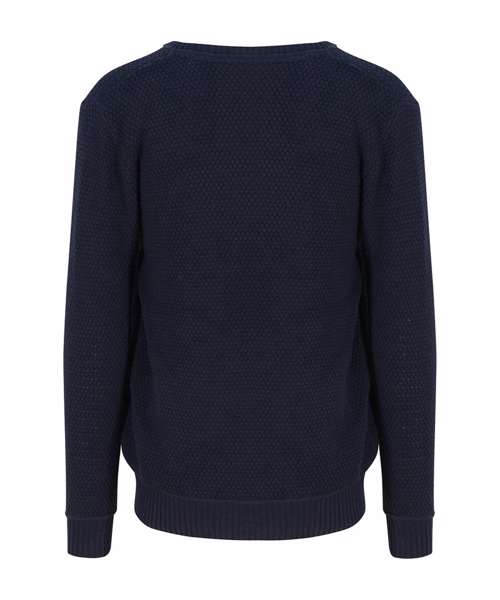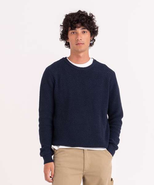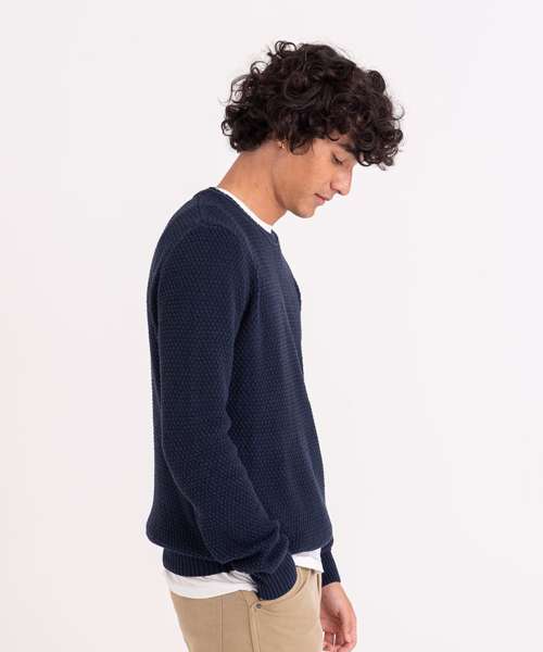 Regenerated cotton blended with recycled polyester sweater. Seed stitch knit with rib neck, cuffs and hem.