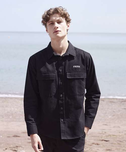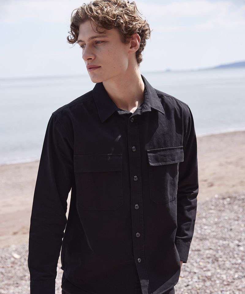 Heavyweight overshirt. Heavy garment wash. Back yoke. Twin-needle topstitching. Plastic horn-effect buttons. Mitred patch pockets with flap. Mitred cuff and placket with button fastening. Curved hem. Forward shoulder seam. Tag-free for easy rebranding.