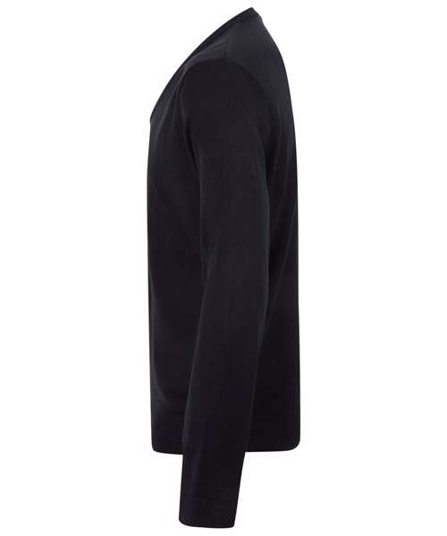 Fine knit 12 gauge v-neck jumper. Semi fashioned sleeve and neck detail. Set-in-sleeves. 1x1 rib and cuff.