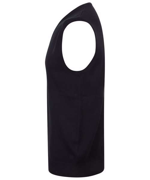 Fine knit. 12 gauge sleeveless v-neck jumper. Semi fashion neck detail. 1x1 rib and cuff.