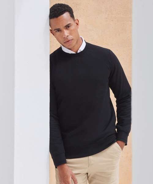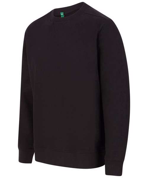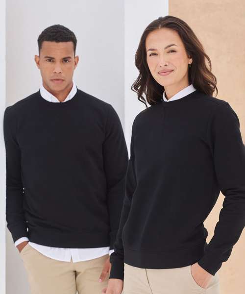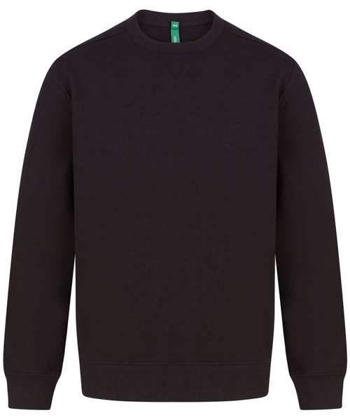Fabric using recycled materials. Regenerated cotton mixed with recycled polyester. Brush back fleece. Set-in sleeves. Ribbed cuffs and hemline. V insert at neckline. Back neck tape. Regular fit. Henbury cut-out label for easy rebranding.