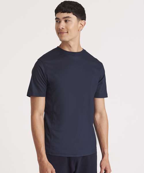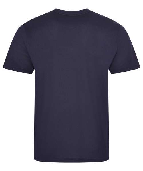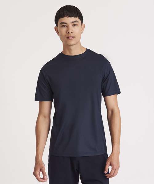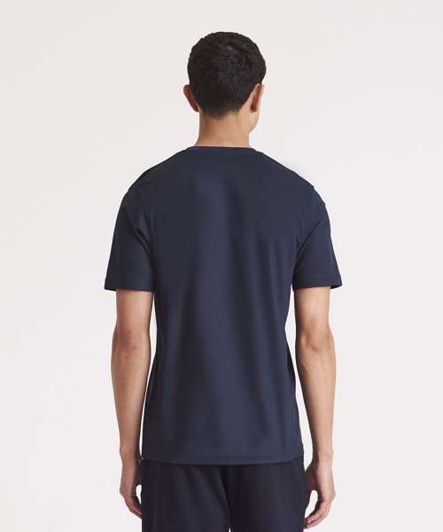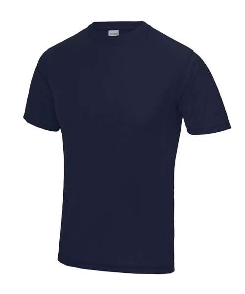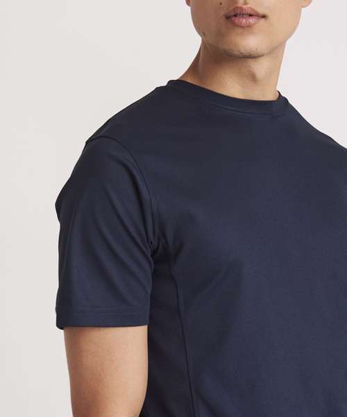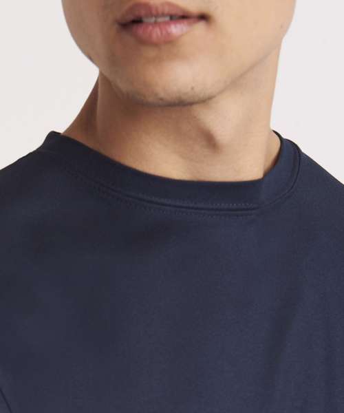 Self-fabric crew neck. Set in sleeve design. Half moon yoke. Self-fabric side panels. Enhanced SuperCool fabric with superior wicking properties and anti-bacterial finish. Self-fabric sapphire blue taped back neck. Twin needle stitching detail. Simple tear off label makes it perfect for rebranding. UPF 30+ UV protection.