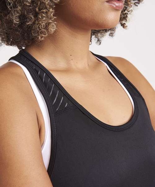 Girlie fit vest with mesh panel and racerback styling. Featuring high performance wicking fabric and dropped hem at back.