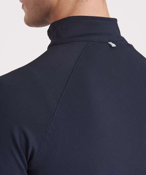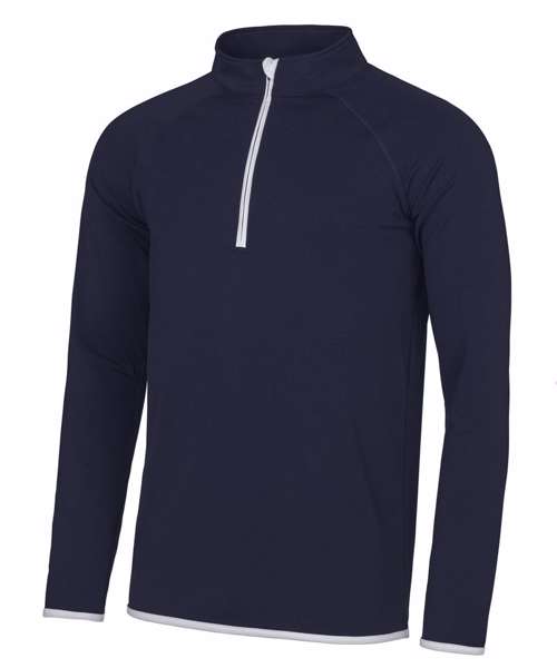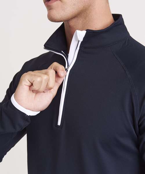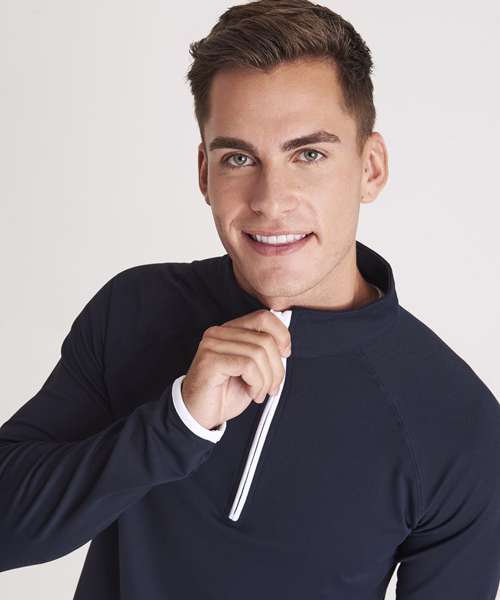 AWDis' own CoolFit blended fabric containing elastane that provides stretch for comfort and a great fit, tight fit, reflective tab on back of neck helps keep ear phone cords in place, self-fabric contrast colour binding at zip, cuffs and hem, raglan sleeve design creates ease of movement, ½ zip with stand-up collar for warmth, chin guard prevents irritation, simple tear off label makes it perfect for rebranding, UPF 30+ UV protection.