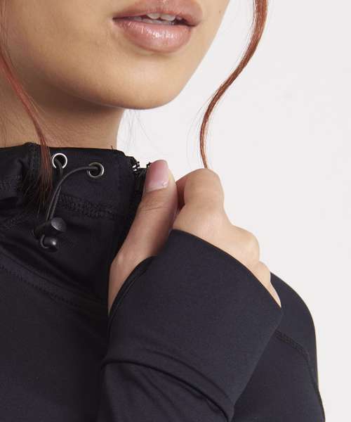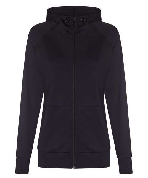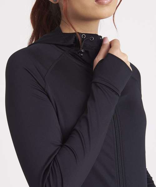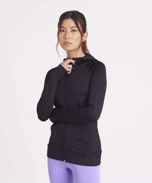 Feminine fit sports zoodie with adjustable drawcords hood, raglan sleeves with thumb holes and full-front zip. Contrast fabric on sleeves and body.