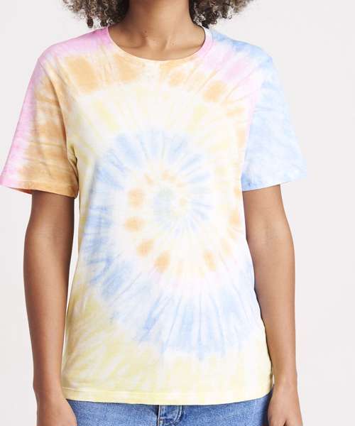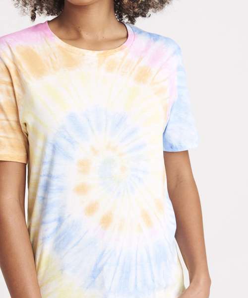 Modern fit with side seams. Short sleeves. Tie-dye design. Every piece is unique. Size label only, for easy rebranding – colour-coded black for unisex. Combed ringspun cotton for ultra comfort. Surface excellent for print or embroidery. Taped neck. Ribbed crew neck style. Twin-needle stitching detail on sleeve and bottom hem.
