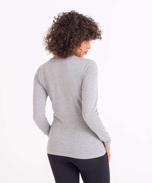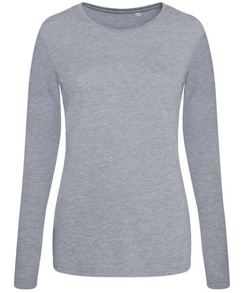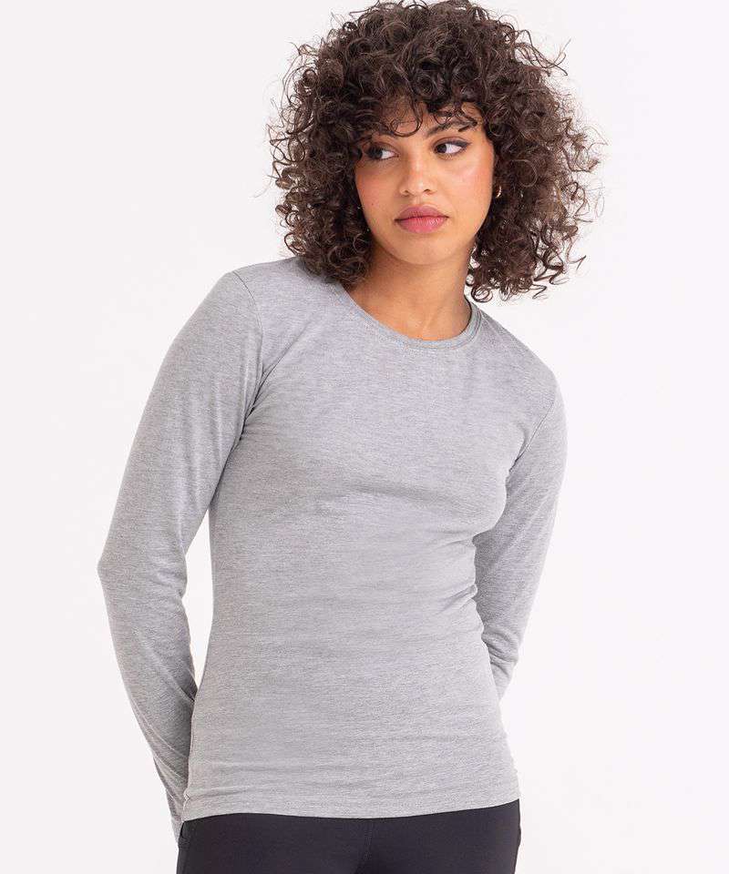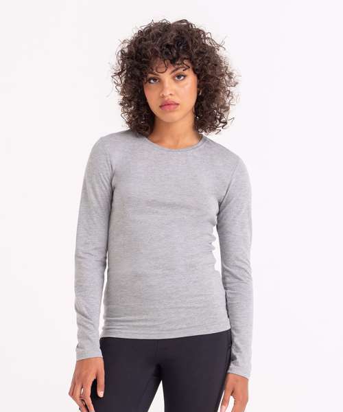 Girlie fit long sleeved T. Size tab label. Triblend fabric for style and comfort. Taped neck. Twin-needle stitching on sleeves and bottom hem. Ribbed crew neck style. soft-feel fabric. Side seams. Set-in sleeves.