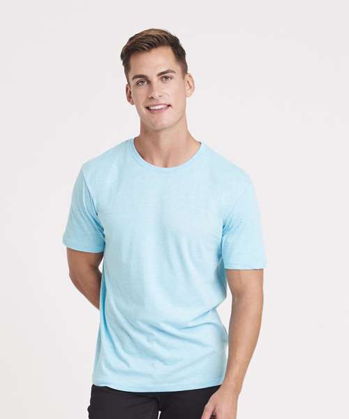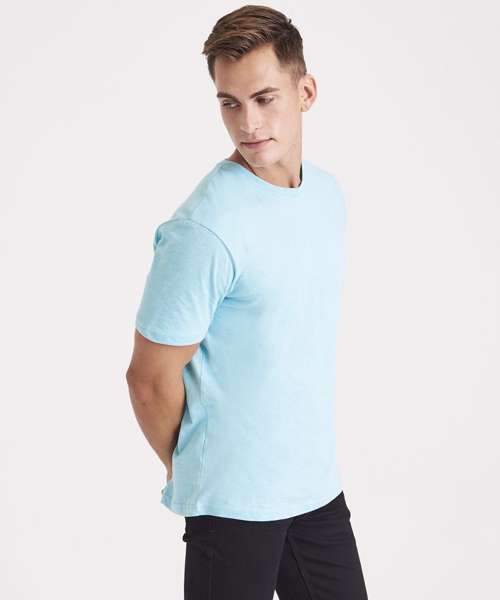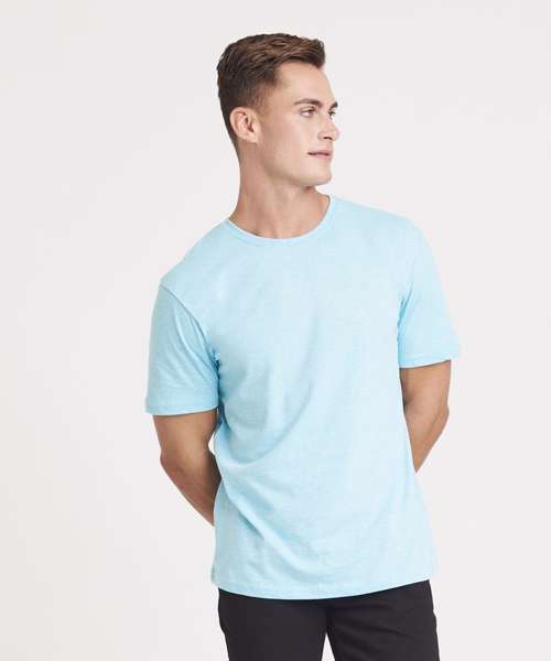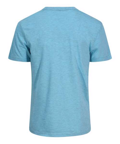 Modern fit. Short sleeves. Ribbed crew neck style with taped back neck. Twin-needle stitching detail on sleeve and bottom hem.