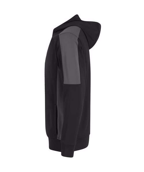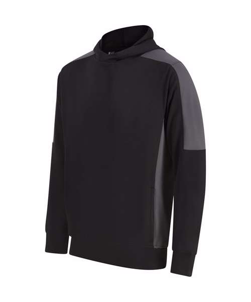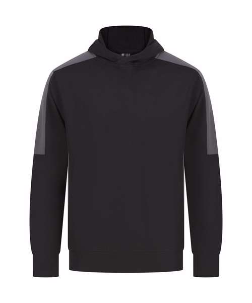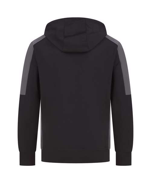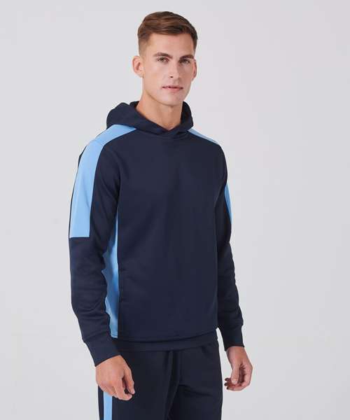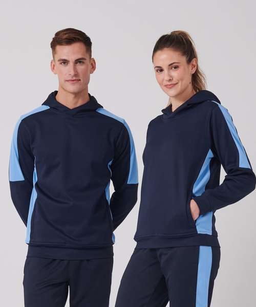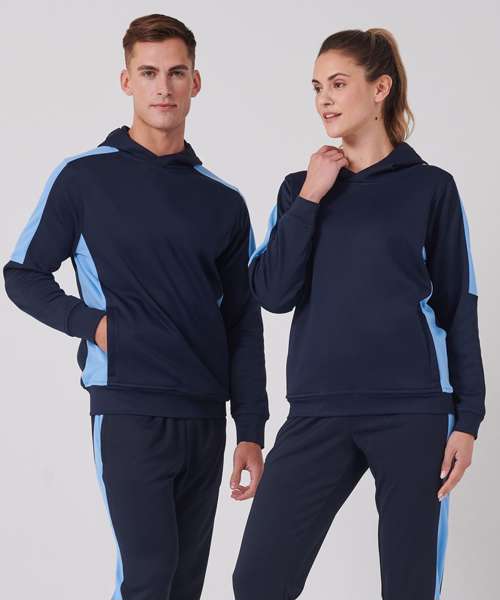 Unisex adults’ polyester hoodie with brushed back fleece inner for comfort. Contrast sleeves and side panelling on contrast only. Ribbed cuffs and hem. Crossover hood neck at centre front. Zipped welt pocket in front panel side seam. Three-piece hood. Offered in contrast and solid colours. Tear-out label.