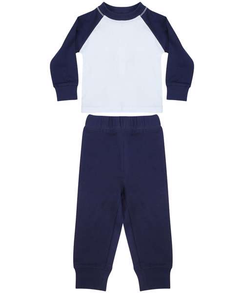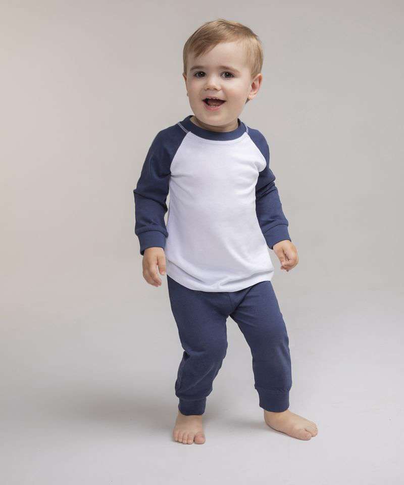 Baseball t-shirt with contrast sleeves and neck binding. Plain hem and cuffs. Twin needle stitching. Contrast plain pants with elasticated waist. Plain rib cuffs. Size tab only.