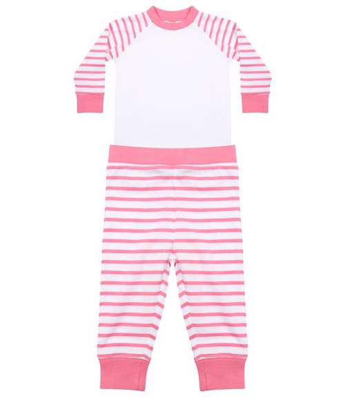 Striped pyjamas in 100% cotton single Jersey with plain 100% polyester front and back body panels suitable for sublimation printing. Contrast ribbed cuffs. Raglan styling. Bodysuit vest. YKK popper fastening. Bound neck and armholes. Made in soft cotton interlock. Size tab only.