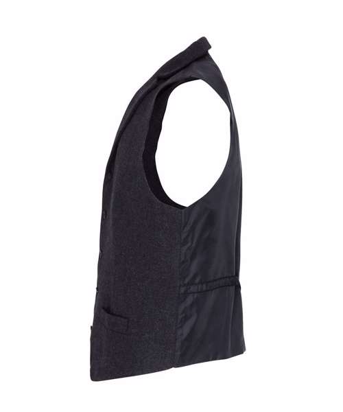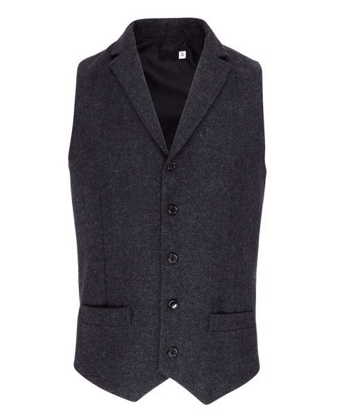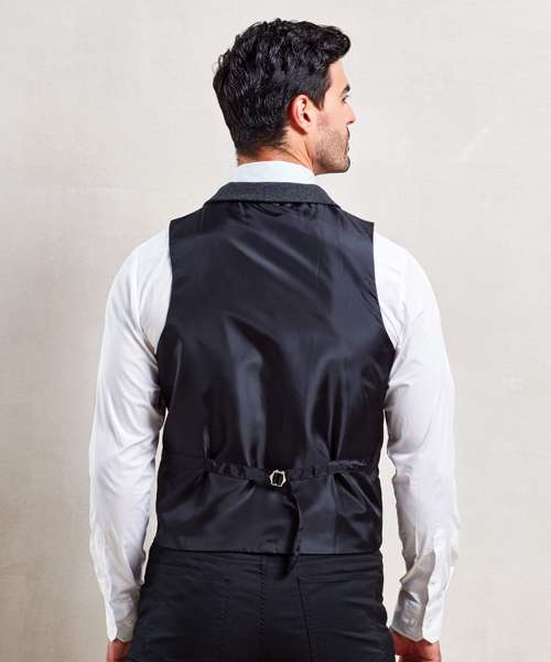 An attractive, versatile waistcoat for men. Styled with a lapel collar that leads into the main body of the waistcoat with five button fastening. The herringbone pattern has been achieved by two coloured yarns being woven together. This waistcoat is fully lined on the underside and to the reverse where there is a buckle for the wearer to adjust accordingly. Features two front open pockets.