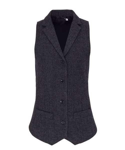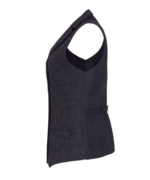 An attractive, versatile waistcoat for ladies. Styled with a lapel collar that leads into the main body of the waistcoat with four button fastening. The herringbone pattern has been achieved by two coloured yarns being woven together. This waistcoat is fully lined on the underside and to the reverse where there is a buckle for the wearer to adjust accordingly. Features two front open pockets.