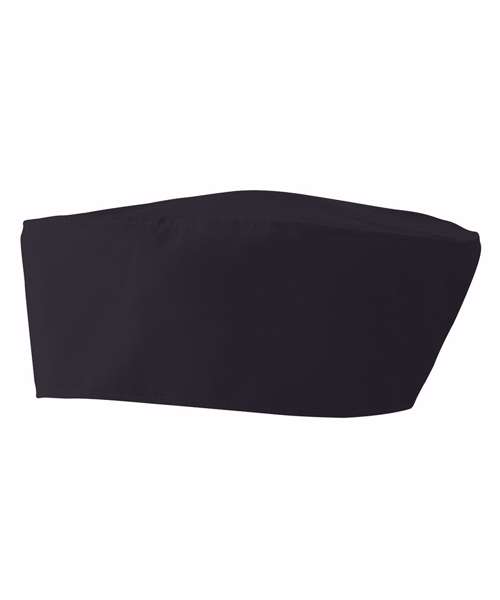 One size fits all. Flat top chef's skull cap. Elasticated back, crease resistant finish.