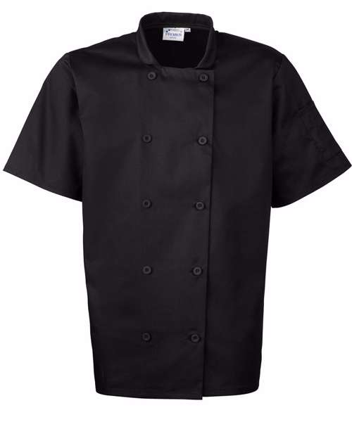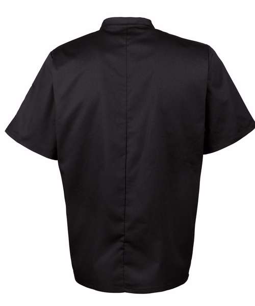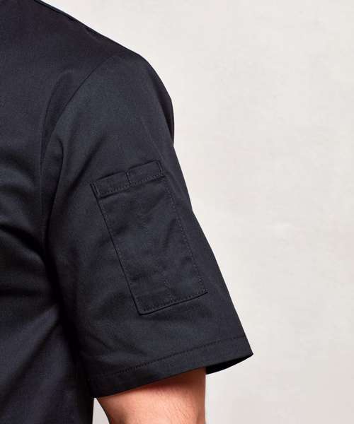 A very popular style seen in commercial kitchens, this short sleeve chef's jacket features a ten button wrap over fastening. To withstand the demands of repeated washing, the buttons are long life resin buttons. A very smart jacket for chef with a mandarin collar for a streamlined look. The left sleeve features a useful pen pocket.