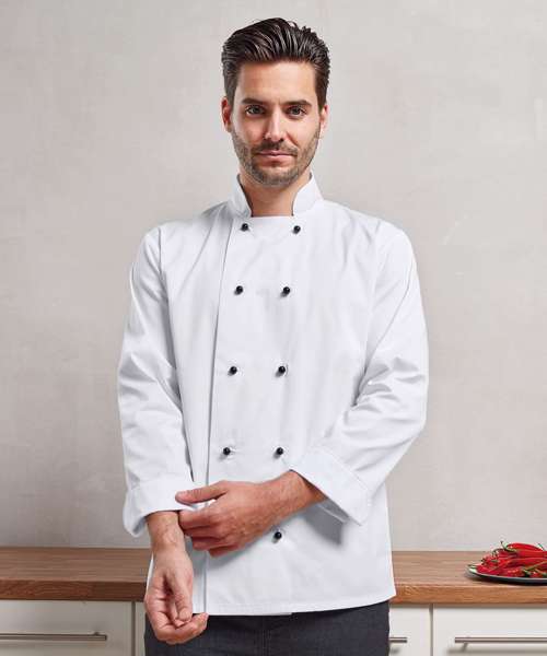 A chef's jacket that features black plastic stud buttons that can be removed and replaced with other colours (PR652) so the culinary team can reflect restaurant branding. Designed with a Mandarin collar with top stitching and turn back split cuffs.