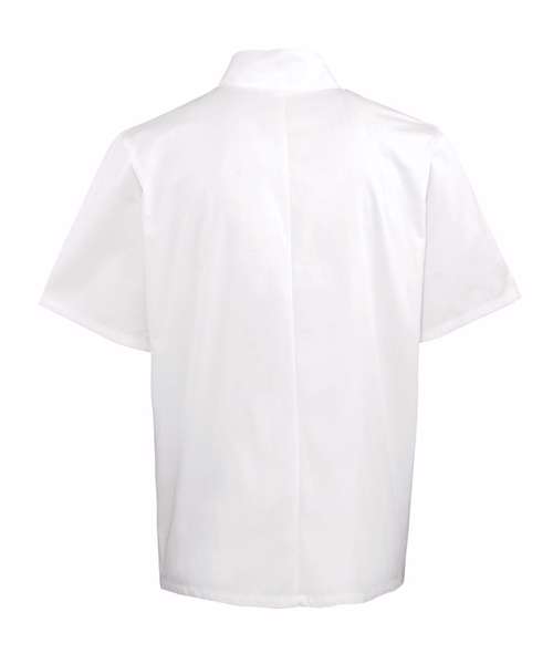 An easy-wearing short sleeve chef jacket with ten metal press studs in a popular wrap over style. Features a Mandarin Collar with topstitching and is available in Black or White.