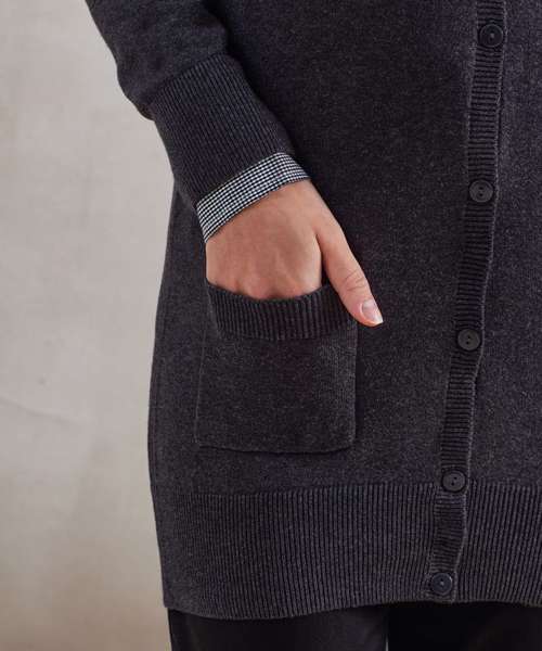 Long length cardigan with cotton rich yarn for a soft feel. Fine gauge knit. Five self-coloured buttons. Two front patch pockets. Ribbed knit v-neck, cuffs and hem.