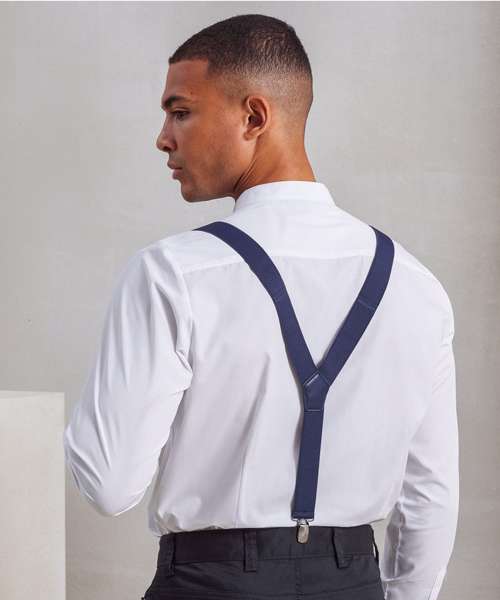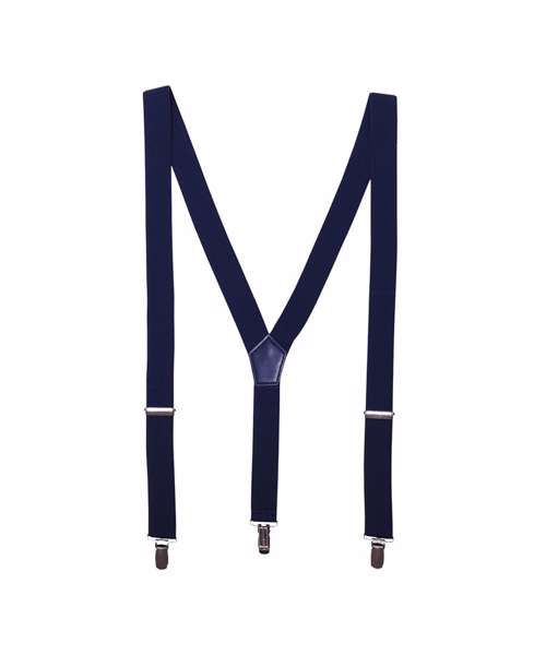Y back trouser braces with stretchy elastic fabric for comfort and style. 3cm strap width. Two metal non slip clips to the front for attachment to trousers. One clip to the back. Metal lock buckles for adjustment making a one-size-fits-all piece.