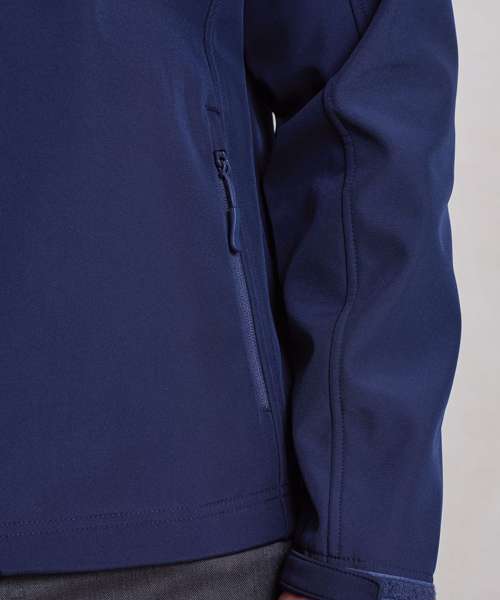 Two-layer softshell jacket with a bonded fleece inner, featuring two handy patch pockets. Full zip-through style with zip pull. Cadet collar with chin guard. Zipped side pockets with zip pulls. Hook and loop strip on cuffs for adjustable fastening. Elastic drawcord to the hem with plastic cord lock to secure in place. Made from 100% certified recycled polyester with Premier’s Windchecker® trademark for a wind- and water-resistant style that is suitable for screen print applications.