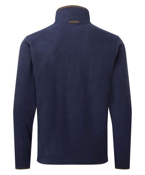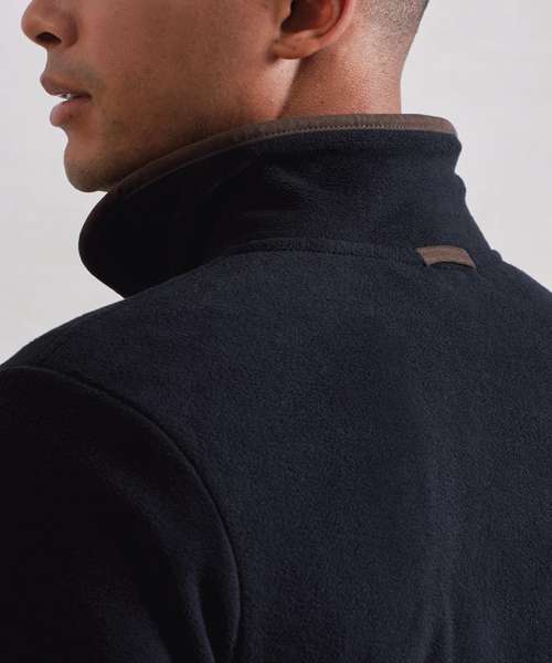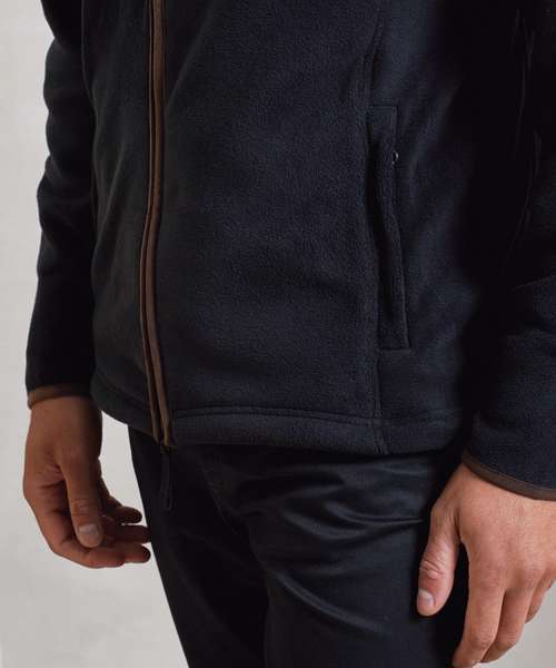 Men’s long sleeve fleece jacket with contrast trim detail. High neck rounded collar, leading into a two-way zipper. Two zipped external pockets and two internal open pockets. Stitched side panel detail. Elasticated cuff with trim detail. Contrast fabric hook on back of collar for hanging up.