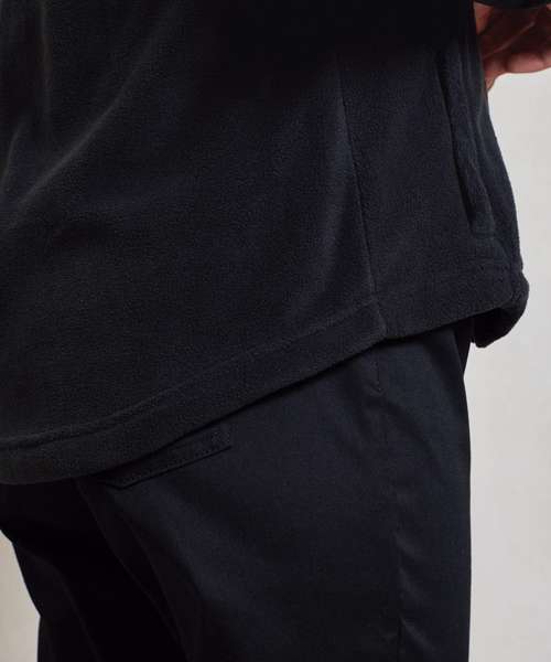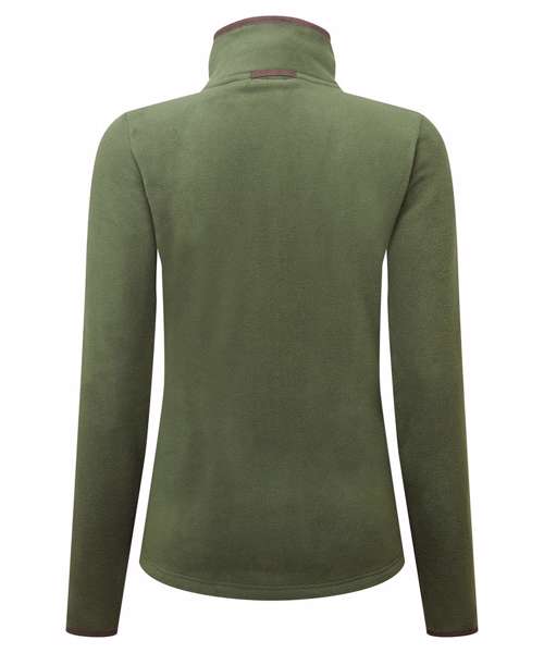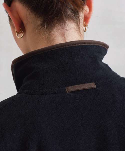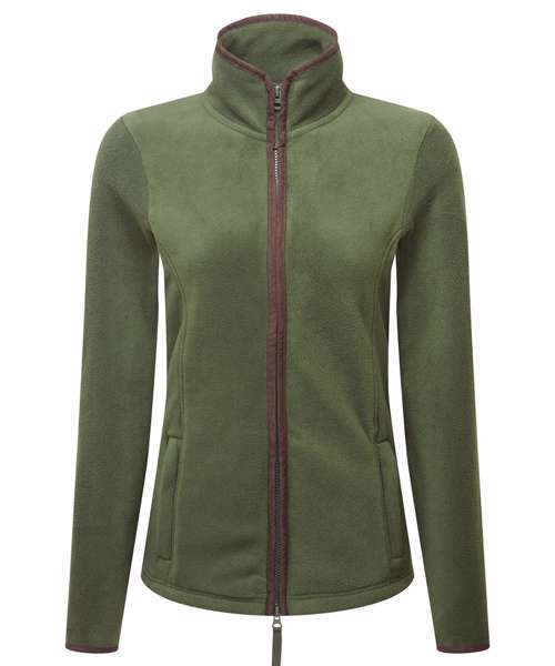Women’s long sleeve fleece jacket with contrast trim detail. High neck rounded collar, leading into a two-way zipper. Two zipped external pockets and two internal open pockets. Stitched side panel detail. Elasticated cuff with trim detail. Contrast fabric hook on back of collar for hanging up.