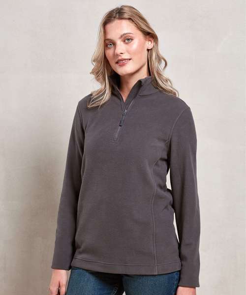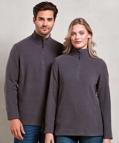 Unisex 1/4 zip microfleece. Anti-pill fabric prevents bobbling. Self-coloured zip pull. Chin guard and storm flap. Cadet collar. Side panels. Straight finished hem. Made from 100% certified recycled polyester.
