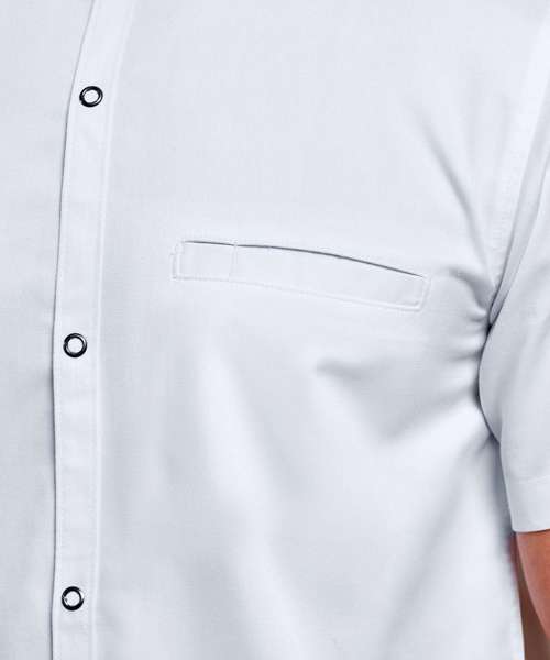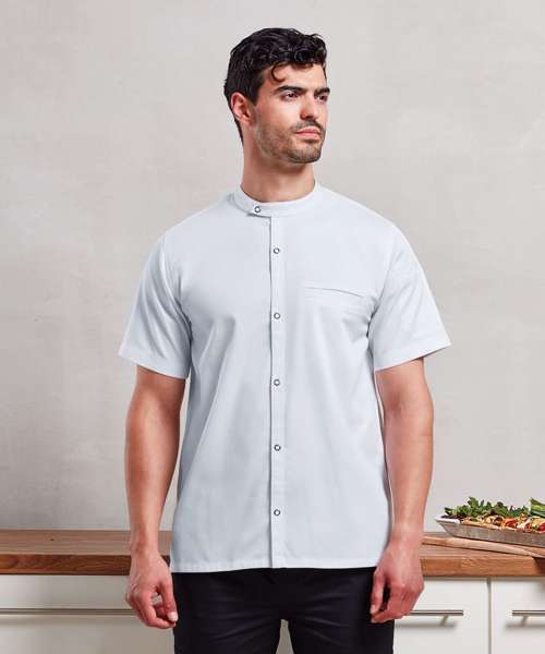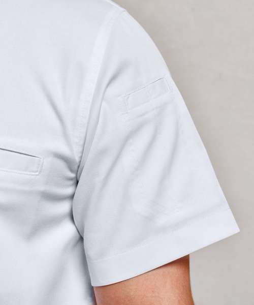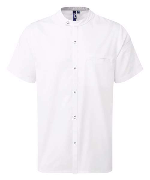 Lightweight short sleeve chef’s shirt made with certified recycled polyester. Mandarin banded collar and press stud closure. Contrast inner neckband. Two pen pockets on left arm. Welt pocket to front left chest with combined pen pocket and faux top stitching. Pocket bag can be moved to allow for embroidery. Back yoke with pleats for ease of movement through chest and shoulders. Press stud tab to the back for hanging or securing an apron in place. Reinforced side seams.
