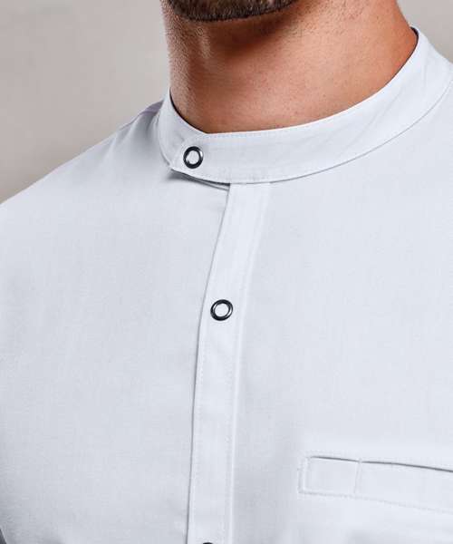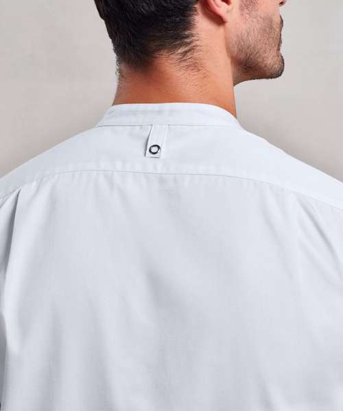 This modern banded-collar chef’s shirt combines the durability of a chef’s jacket with the lightweight nature of a shirt. It has an asymmetric mandarin collar with pop-stud fasteners down the front for easy wearing, while a contrast inner neckband helps to conceal marks from day-to-day wear. Pocket bag can be moved to allow for embroidery. Made with a combination of certified recycled polyester and cotton.