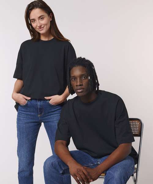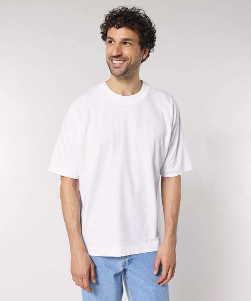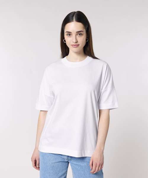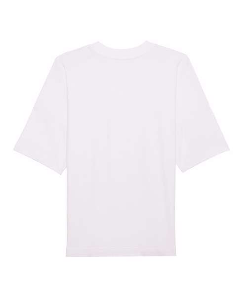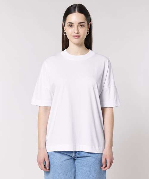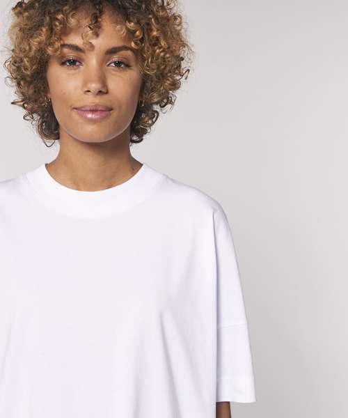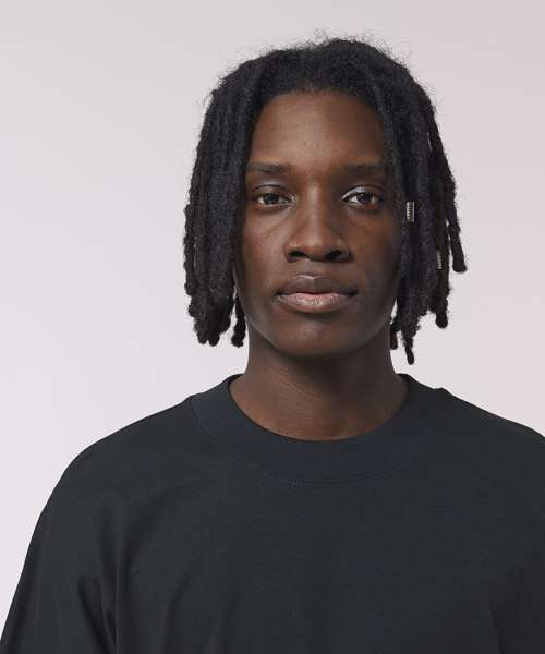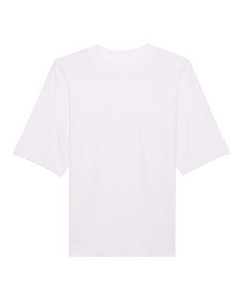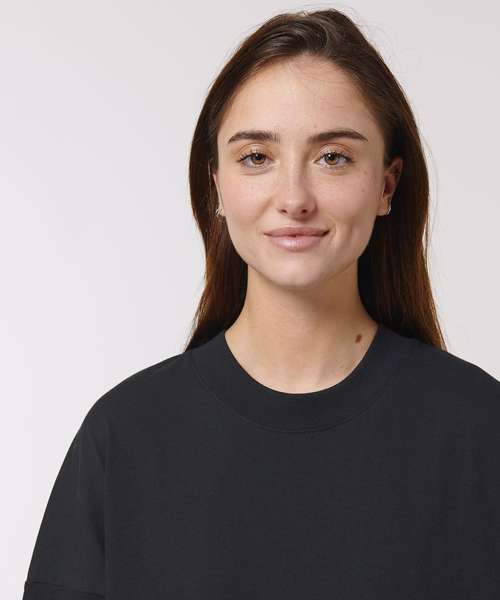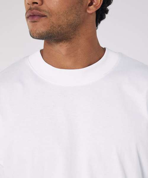 Set-in sleeve. Dropped shoulder. Wide 1x1 rib neck collar with single topstitch. Inside back neck tape in self-fabric. Sleeve hem and bottom hem with wide double topstitch.