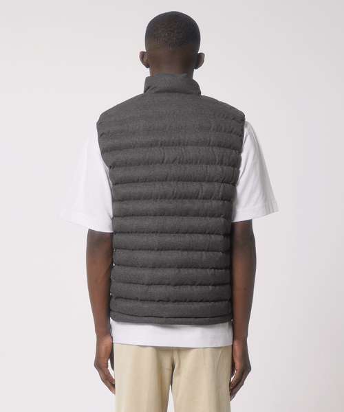 Men’s wool-like bodywarmer. Sleeveless. High collar. Reverse nylon zip at centre front. Zipped welt pockets with extra grosgrain pull. Elastic tape binding at armhole. Fully quilted. Side panels for better shape. Inside seams with binding finish. Bottom hem with adjustable plastic stopper and elastic cord.