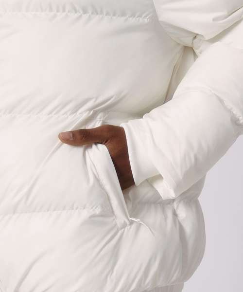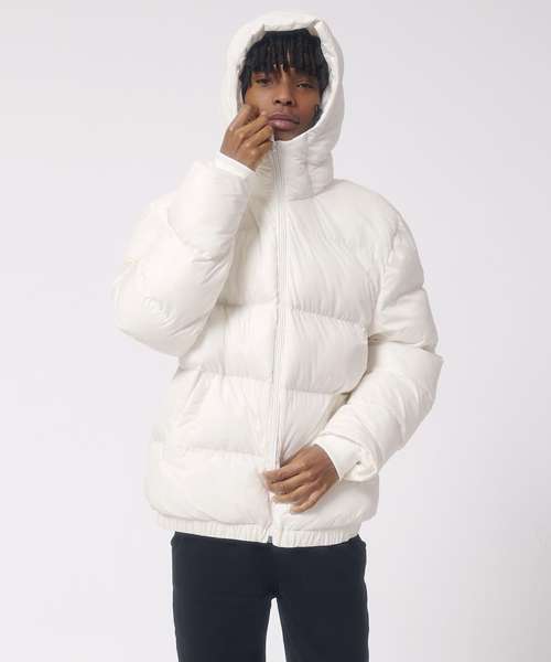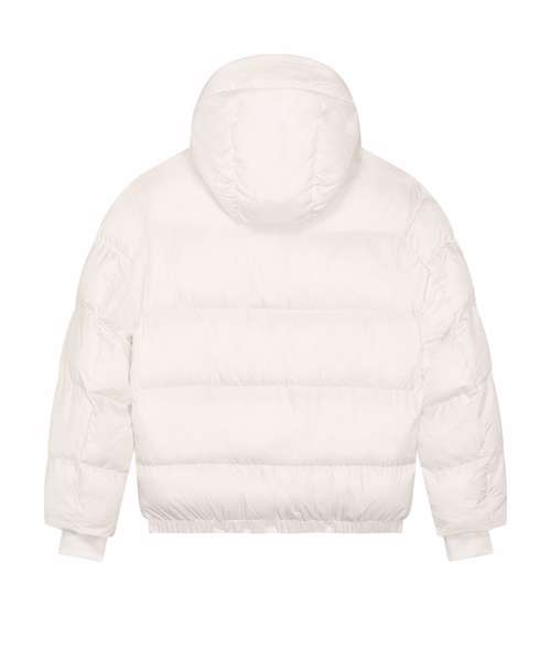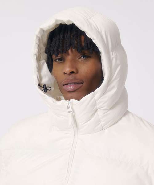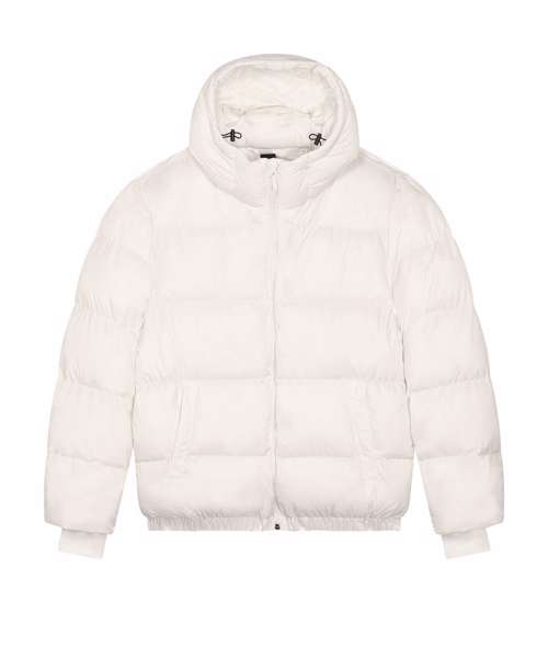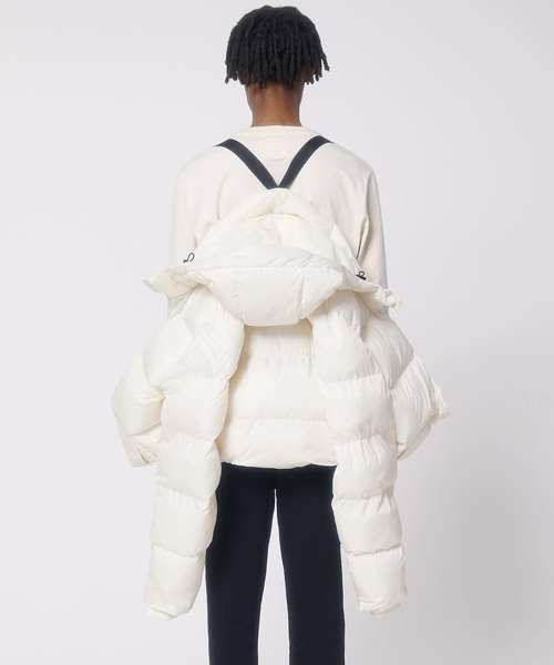 Oversized puffer jacket. Set-in sleeve. 1x1 rib at sleeve cuff. Elastic bottom hem. Lined hood with adjustable plastic stoppers and elastic cords on inside. Nylon zip at centre front with chin guard. Zipped welt pockets with extra grosgrain tape. Self-fabric half-moon at back neck. Inside zipped chest pocket. Grosgrain straps on inside for versatile and hands-free carrying. Inside zip opening at bottom hem and wearer’s left chest for easy decoration.