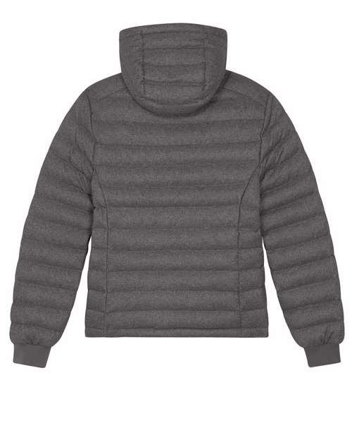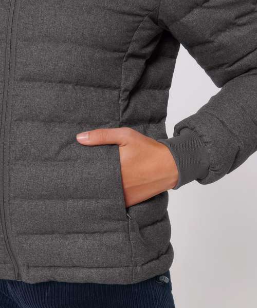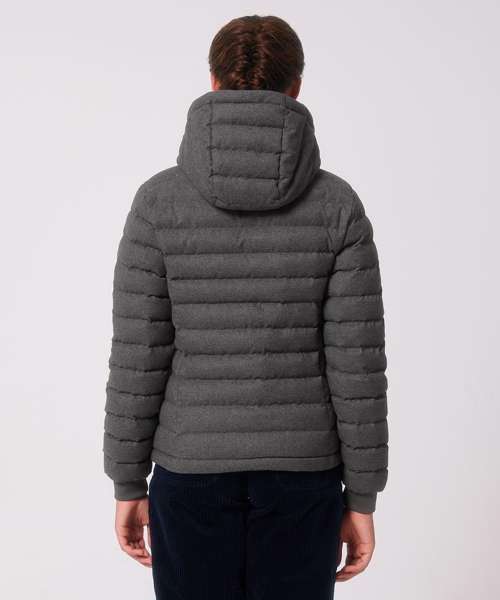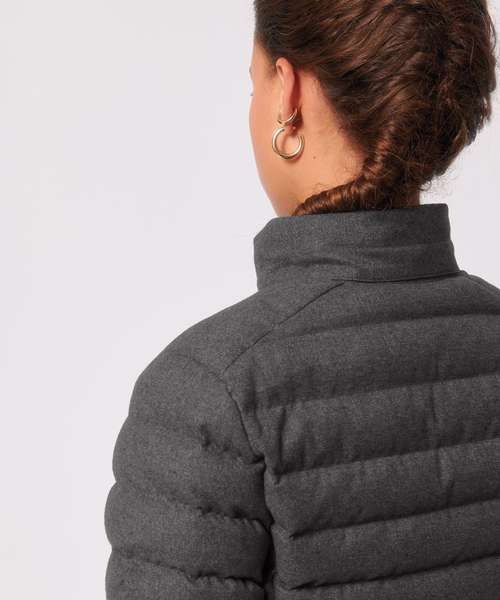 Wool-like women’s padded jacket. Set-in sleeve. High collar with detachable hood and matte metal hidden snaps. Hood opening and bottom hem with adjustable plastic stopper and elastic cord. Reverse nylon zip at centre front. Zipped welt pockets with extra grosgrain pull. Fully quilted. Side panels for better shape. Soft 1x1 rib at sleeve hem.