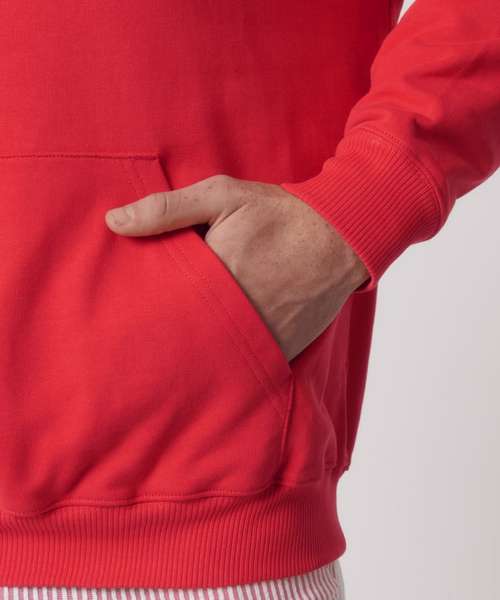 Unisex boxy dry hand-feel hoodie sweatshirt. Set-in sleeve. Double-layered hood in self-fabric. Inside single Jersey back neck tape. Self-fabric half-moon at back neck. Single needle topstitch at neckline and along hood opening. 2x1 rib at sleeve hem and bottom hem. Armhole, sleeve hem and bottom hem with twin-needle topstitch. Kangaroo pocket at front.
