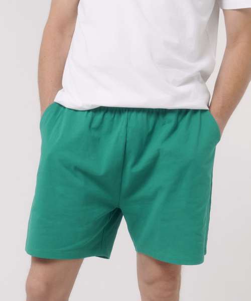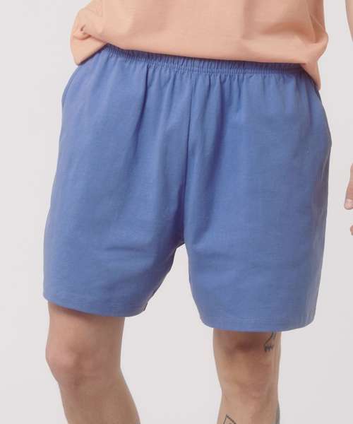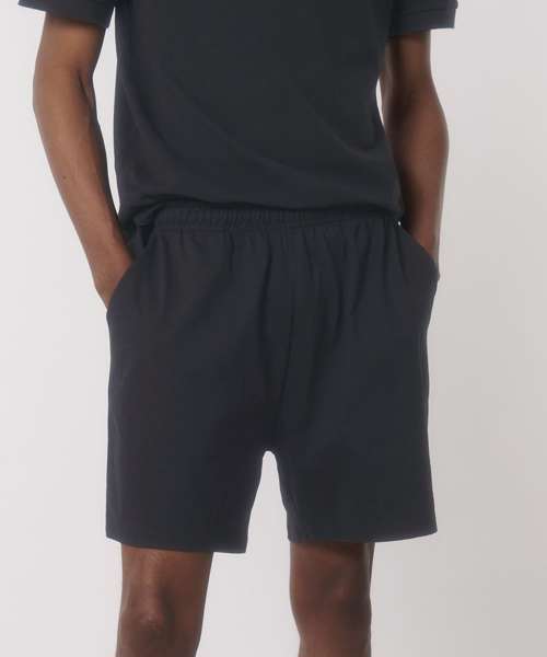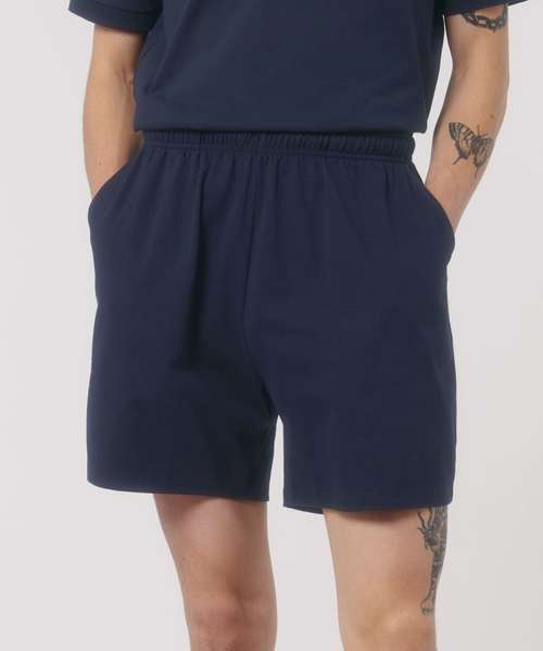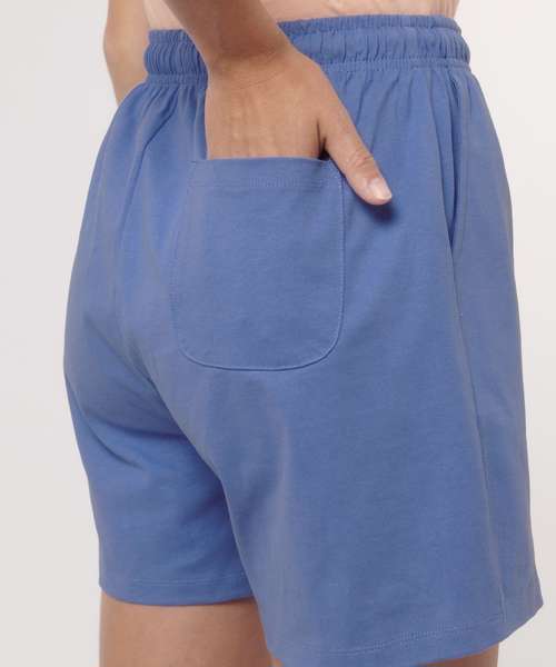 Unisex lightweight shorts with self-fabric elastic waistband. Hidden flat drawcords on the inside of the waistband. Pockets at the front and patch pockets at the back.
