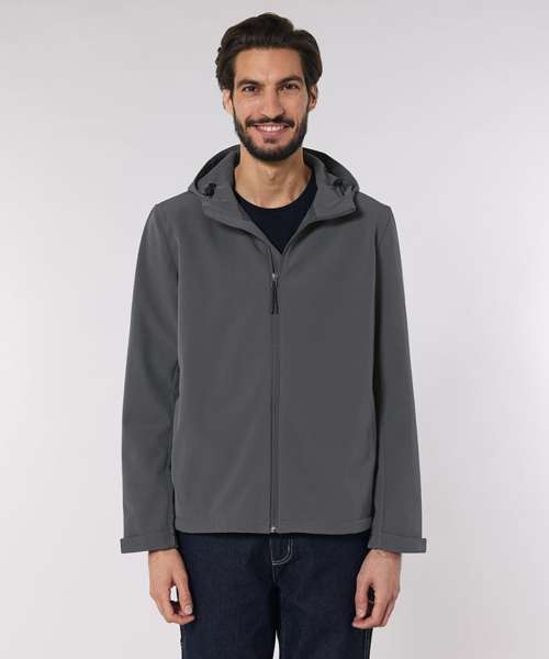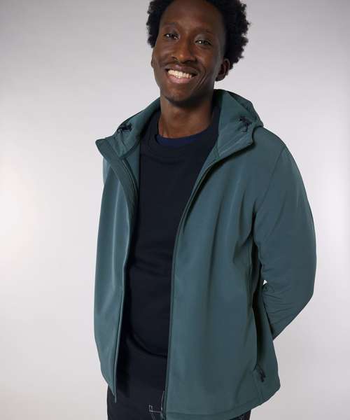 Men’s hooded softshell jacket, medium fit, with set-in sleeve and a high collar with panelled hood. Hood opening and bottom hem with adjustable plastic stopper and elastic cord. Reverse nylon zip at centre front. Zipped welt pockets with reflective elastic puller. Bonded three-layer fabric with internal membrane . Fully bonded fleece inside layer. Side panels and stretch for better shape. Adjustable hook and loop sleeve opening. Inside seams finished with recycled binding. Water-repellent up to 10,000mm, breathability up to 3000G/M2/24hrs allowing perspiration to escape. Windproof. Bionic ECO DWR (durable, water-repellent) finish.