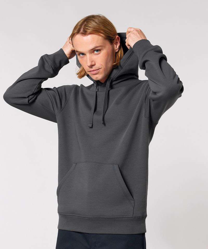 Essential unisex hoodie sweatshirt in medium fit with set-in sleeve. Self-fabric lined hood. Flat drawcords in matching body colour. Stitched buttonhole eyelets. Inside herringbone back neck tape. Self-fabric half moon at back neck.1x1 rib at sleeve hem and bottom hem. Flatlock topstitch on all seams. Kangaroo pocket with flatlock topstitch.
