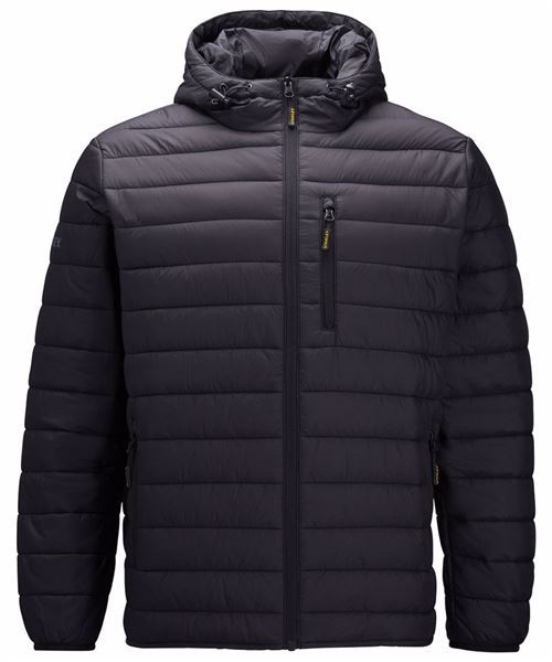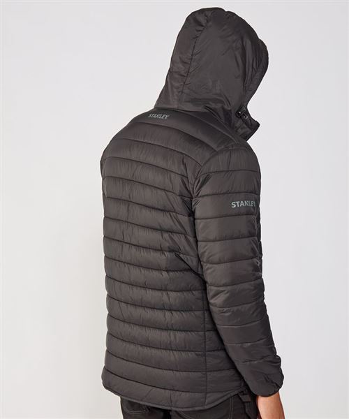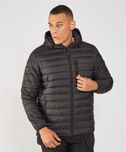 Insulated zip-through jacket with hood, chest pocket and narrow baffles. Water-resistant. Zipped pockets. UKAS certified. ISO certified.