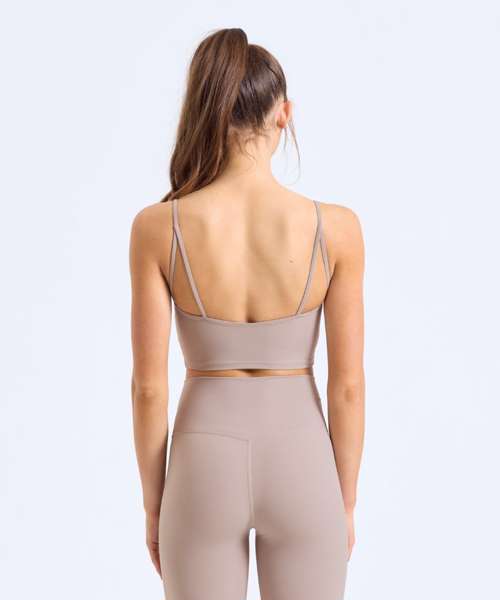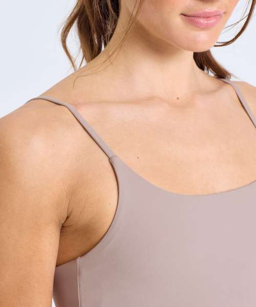 Certified recycled nylon. Stretch. Smooth finish. Medium impact. Hidden sports bra inner with removable bra pads for additional support. Double-layer back strap detail.