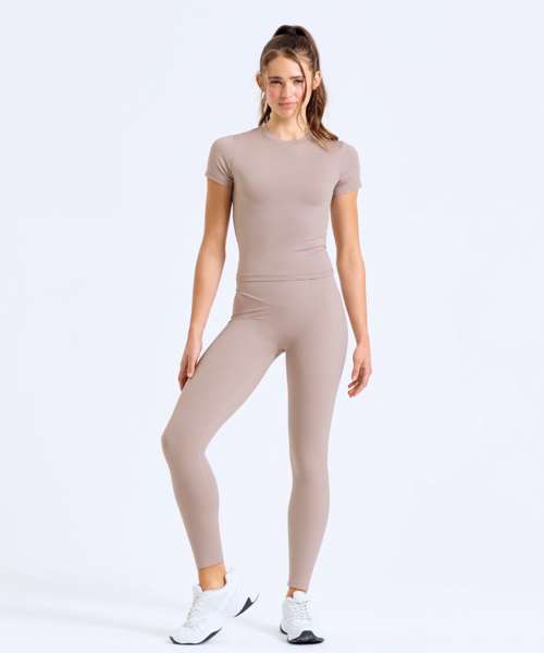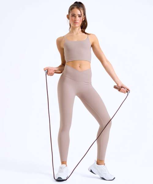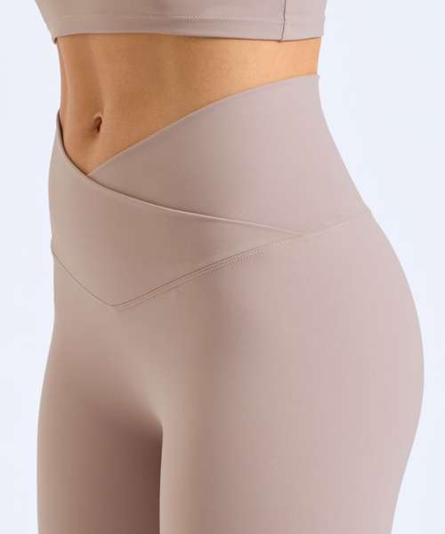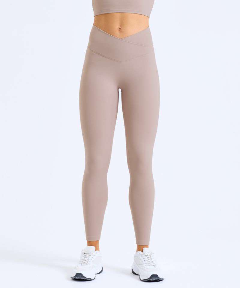 Certified recycled nylon. Stretch. Smooth finish. Cross front waistband. Full-length. Minimal seams.