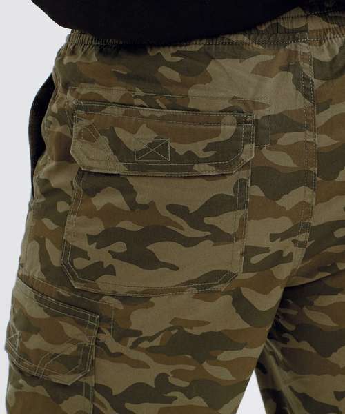 Two swings pockets with coin pocket and two back bellowed pockets with hook and loop fastening. Bellowed pockets to either leg with hook and loop fastening. Elasticated waistband with drawstrings. Gunmetal eyelets and drawstring ends. Fly stitched detailing. Soft finish fabric.