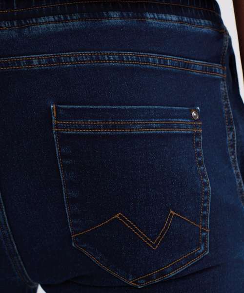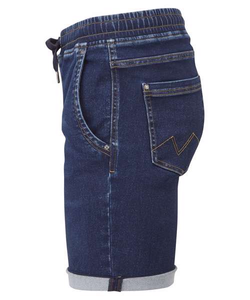Two swing pockets and two back patch pockets with gunmetal cap detailing. Elasticated waistband with drawstrings. Gunmetal eyelets and caps to drawstrings. Stitched fly detailing. Worn denim effect. Contrast stitching. Shorts can be worn rolled up.